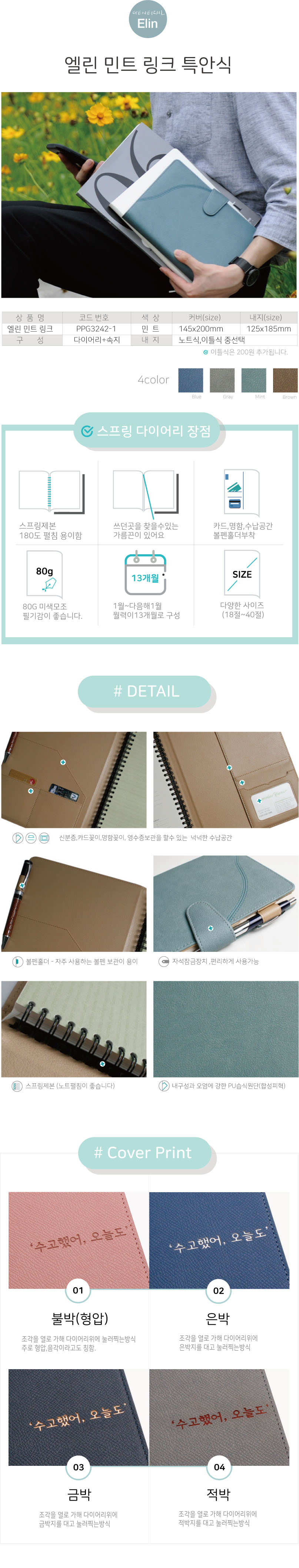 엘린 링크(자석) 특안식 스프링 다이어리 / 민트 / 32절