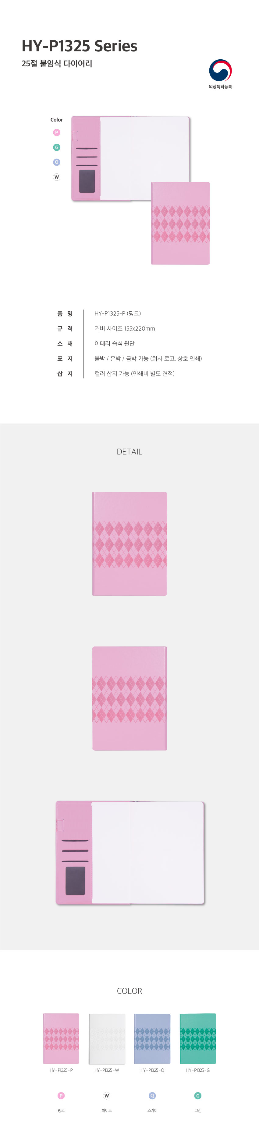 HY P1325 양장 붙임식 다이어리 / 핑크 / 25절