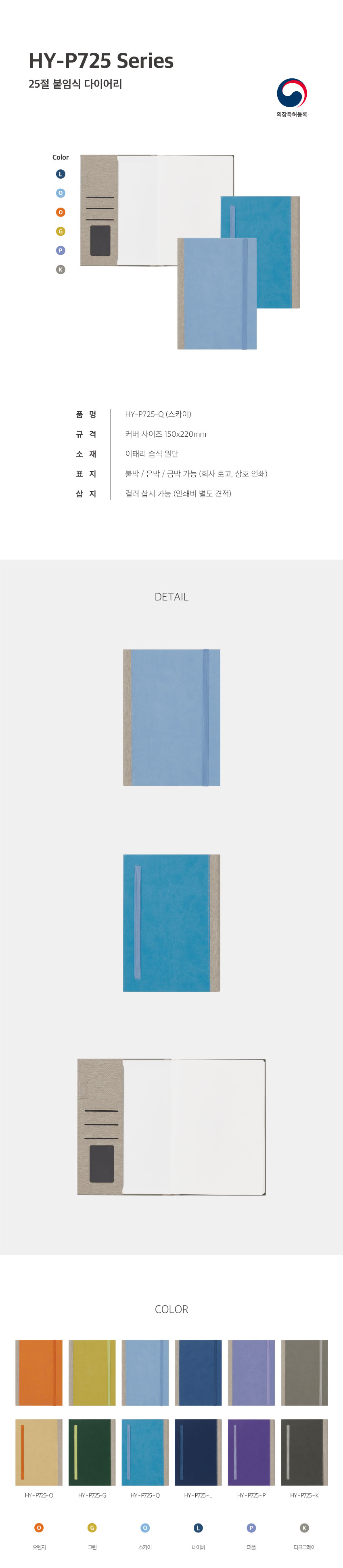 HY P725 양장 붙임식 다이어리 / 스카이블루 / 25절