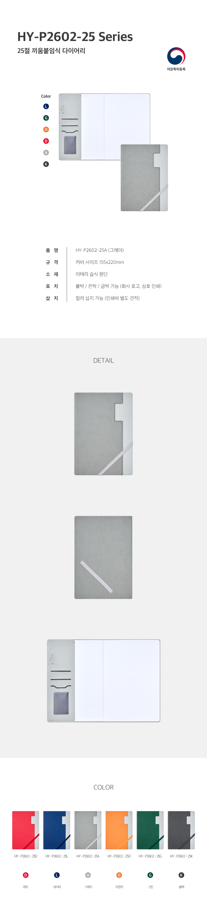 HY P2602 양장 붙임식 다이어리 / 그레이 / 25절